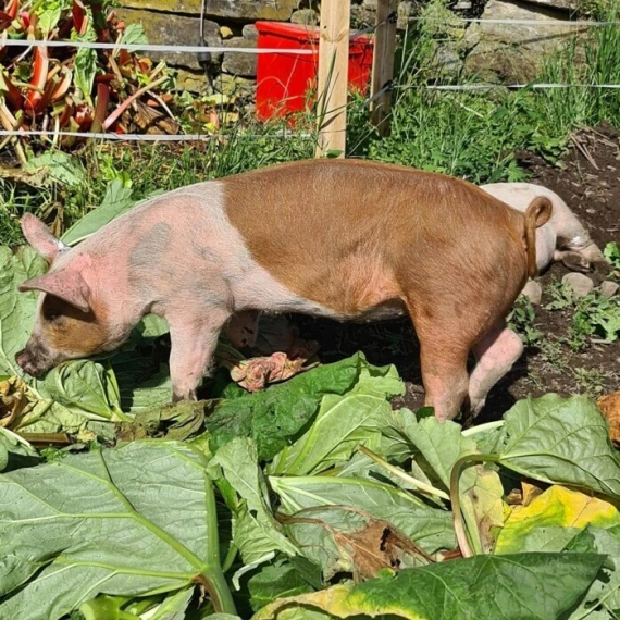 Derfor får grisene fri tilgang til økologisk soyafritt kraftfor, og dette gjenspeiler seg i det hvite fettet i og rundt kjøttet. I tillegg til kraftfor får de også fri tilgang til vann og økologisk grovfor som er produsert her på gården. Utover dette spiser grisene rabarbra, frukt, grønnsaker og bær fra gården (øko), samt nøtter, urter, røtter og insekter de finner ute i skogen og på beitene.