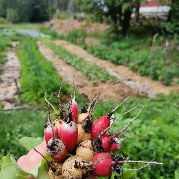 Grønnsakene er dyrket for hånd med kjærlighet til jord, natur, insekter og planter. De er godkjent økologiske av Debio og vi driver regenerativt, det vil si at vi bygger opp gårdens ressurser på lag med naturen.