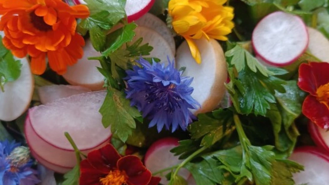 Vi har knasende sprø grønnkål, lilla knutekål, beter i mange farger, vårløk, persille, salat og spiselige blomster klar til høsting. En og annen agurk er allerede moden og kanskje en bunt reddiker. Om ikke lenge har vi tidlig spisskål, mynte og tomater til salgs. Nypotetene skal vi også gi beskjed om når dere kan kjøpe, de vet vi mange av dere gleder dere til.
